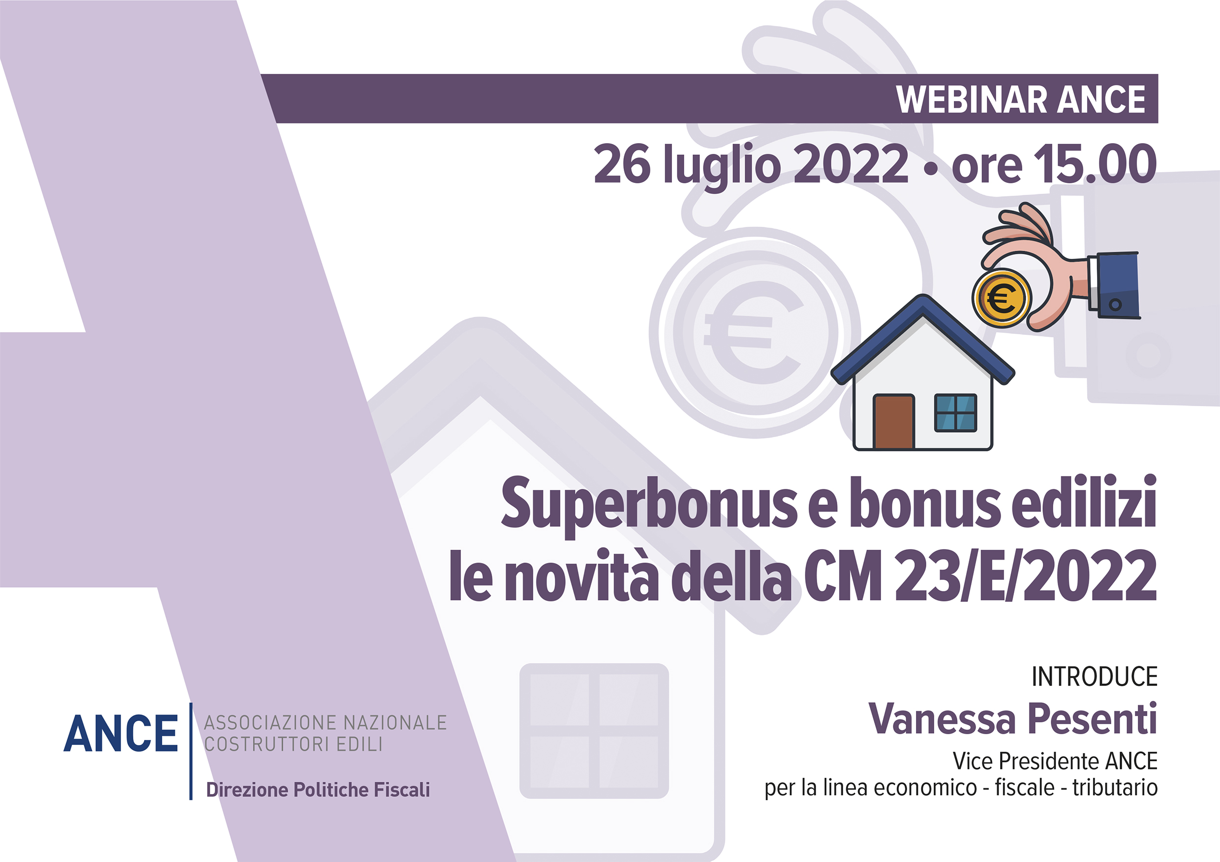 Proprio per fare il punto sulle linee interpretative fornite dall'Agenzia delle Entrate sui vari ambiti del Superbonus, da quello soggettivo a quello oggettivo e procedimentale, ANCE nazionale ha organizzato un webinar on line il prossimo 26 luglio alle ore 15.00.