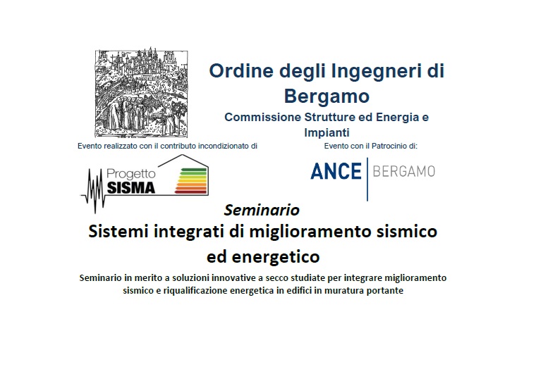 Seminario on-line organizzato dall'Ordine degli Ingegneri, con la collaborazione di Progetto Sisma e il patrocinio di ANCE Bergamo, relativo a soluzioni innovative a secco studiate per integrare miglioramento sismico e riqualificazione energetica in edifici in muratura portante.