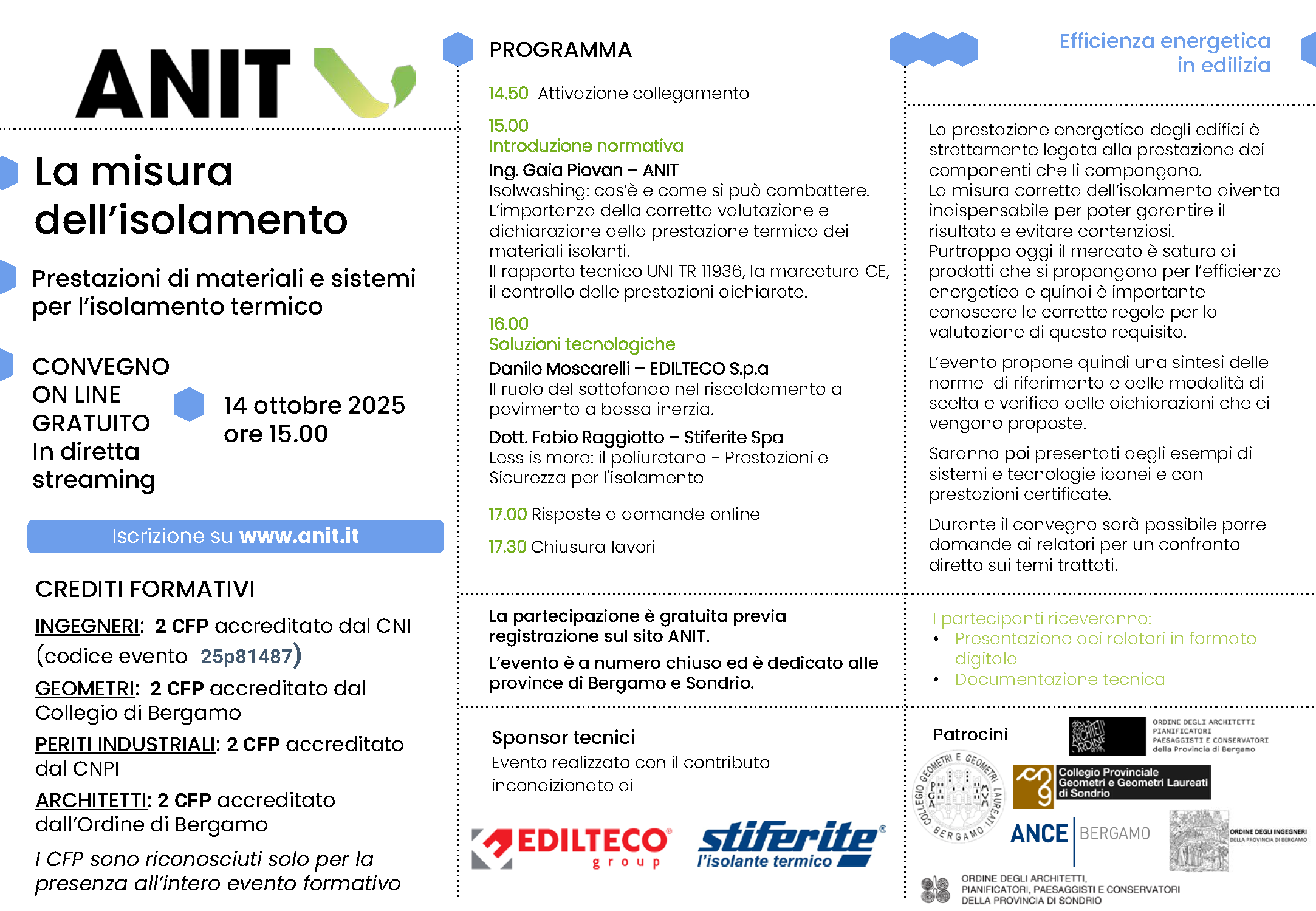 In data 14 ottobre 2025 in diretta streaming si terrà il convegno La misura dell’isolamento. Prestazioni di materiali e sistemi per l’isolamento termico, organizzato da ANIT con il patrocinio, tra gli altri, di ANCE Bergamo.