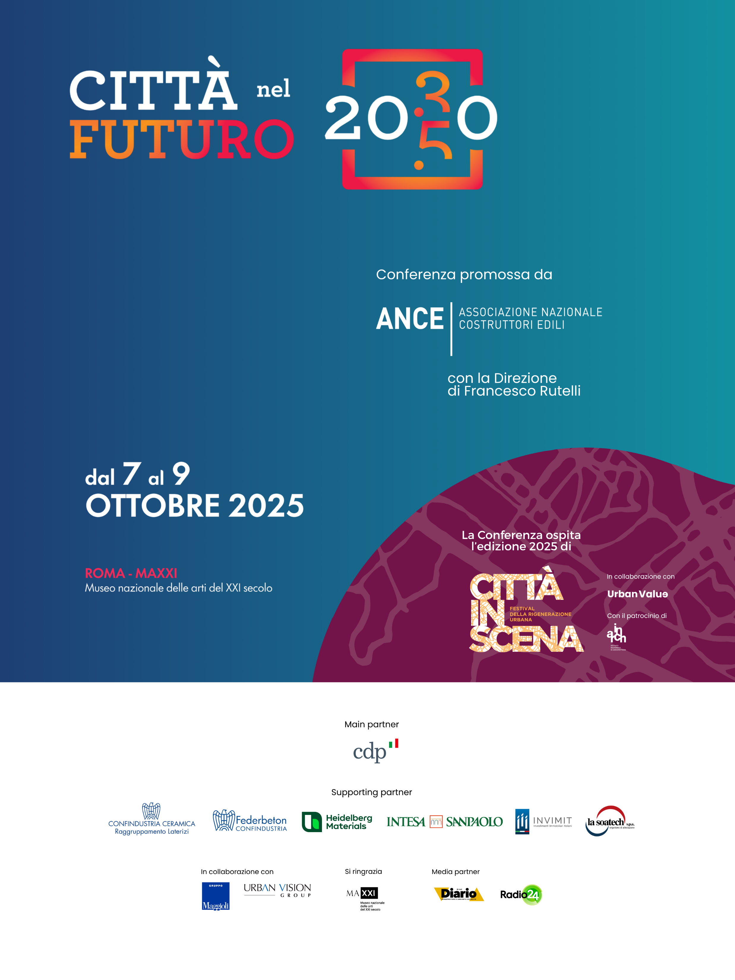 Dal 7 al 9 ottobre si terrà la conferenza "Città nel Futuro 2030-2050" promossa da Ance con la direzione di Francesco Rutelli, e realizzata in collaborazione con importanti partner.