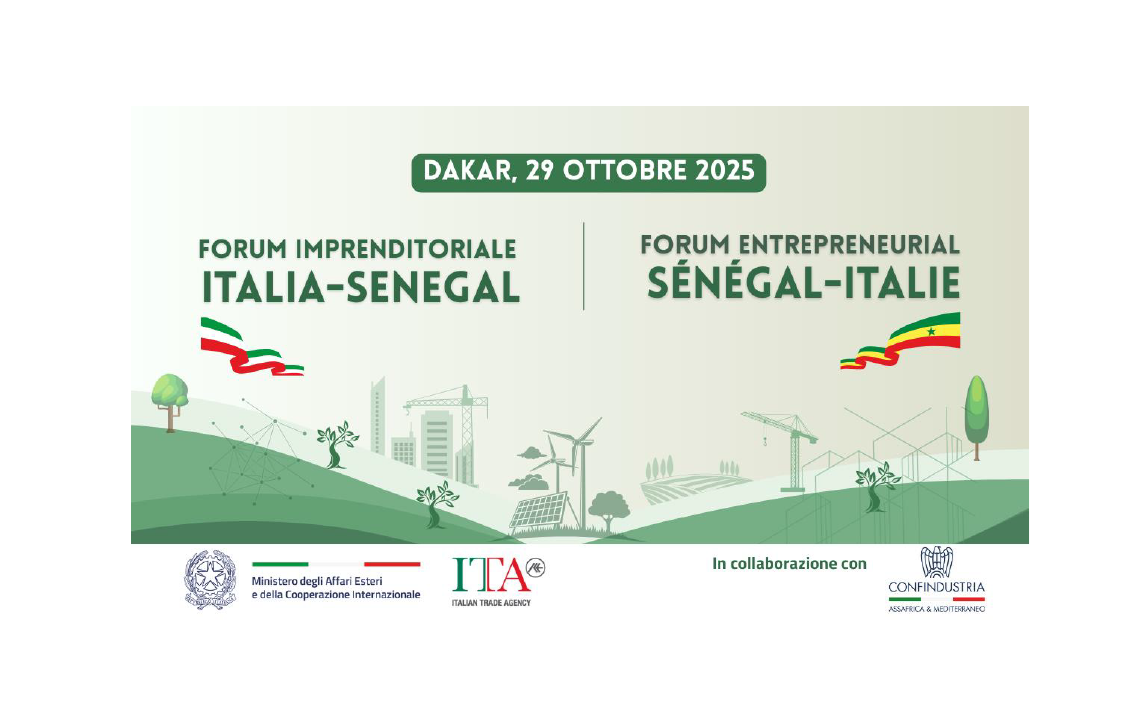 Il Ministero degli Affari Esteri e della Cooperazione Internazionale, organizza, insieme all’Agenzia ICE e in collaborazione con Confindustria Assafrica & Mediterraneo, il Forum Imprenditoriale Italia-Senegal, che si terrà a Dakar il 29 ottobre 2025.
