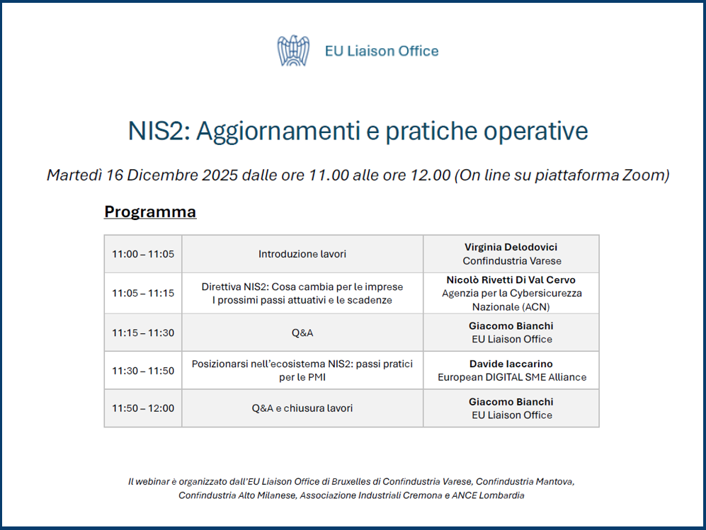 Martedì 16 dicembre 2025, dalle ore 11 alle ore 12, si terrà il webinar organizzato dall’EU Liaison Office presso la Delegazione di Confindustria a Bruxelles per Confindustria Varese, Confindustria Alto Milanese, Associazione Industriali Cremona, Confindustria Mantova e ANCE Lombardia, dal titolo “NIS2: Aggiornamenti e pratiche operative”.