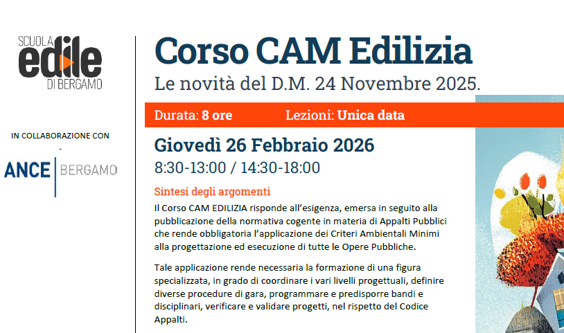 Il Corso CAM EDILIZIA, organizzato da Scuola Edile di Bergamo in collaborazione con ANCE Bergamo, risponde all’esigenza, emersa in seguito alla pubblicazione della normativa cogente in materia di Appalti Pubblici che rende obbligatoria l’applicazione dei Criteri Ambientali Minimi alla progettazione ed esecuzione di tutte le Opere Pubbliche.