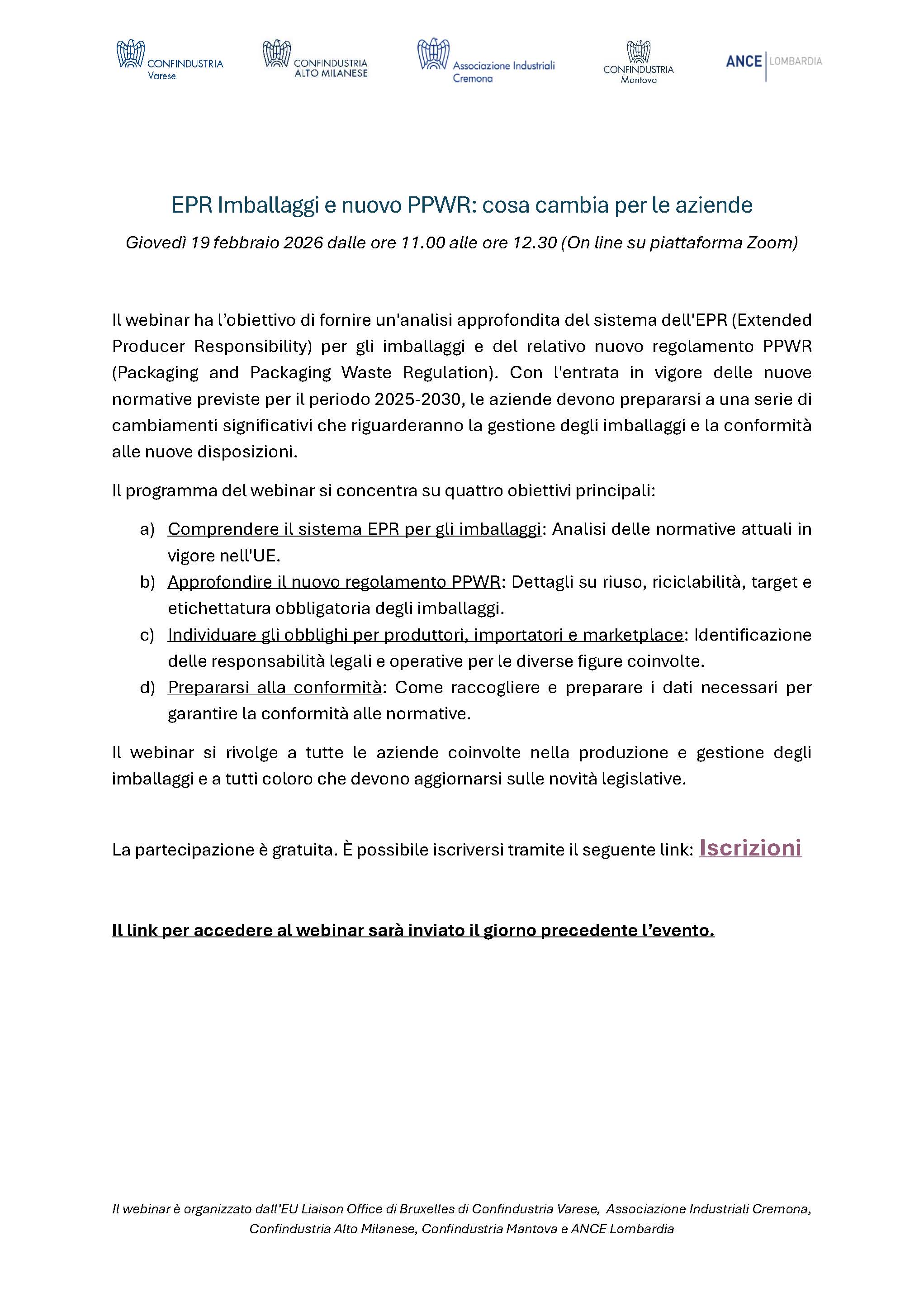 Si informa che L’EU Liaison Office presso la Delegazione di Confindustria a Bruxelles per Confindustria Varese, Confindustria Alto Milanese, Associazione Industriali Cremona, Confindustria Mantova e ANCE Lombardia, organizza, a partire dal mese di febbraio, una serie di webinar in tema di Responsabilità Estesa del Produttore nell’Unione europea.