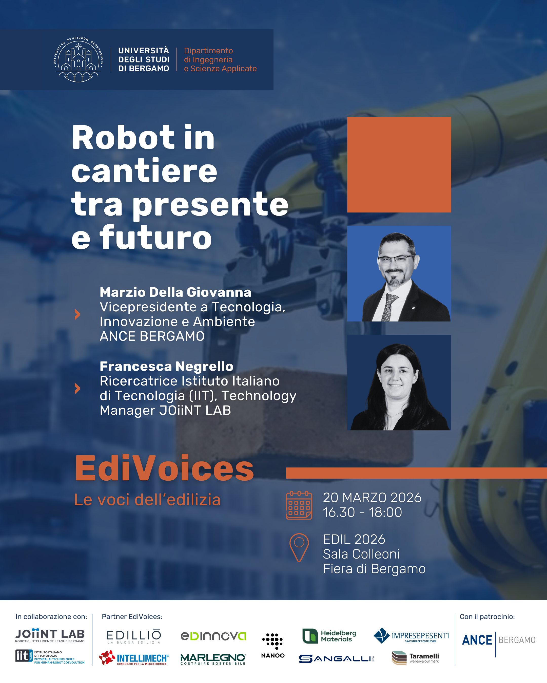 Nell'ambito della fiera Edil 2026 Next, è programmato per venerdì 20 marzo dalle 16.30 alle 18.00 l'incontro del ciclo EdiVoices - Le voci dell’edilizia patrocinato da ANCE Bergamo dal titolo Robot in cantiere tra presente e futuro