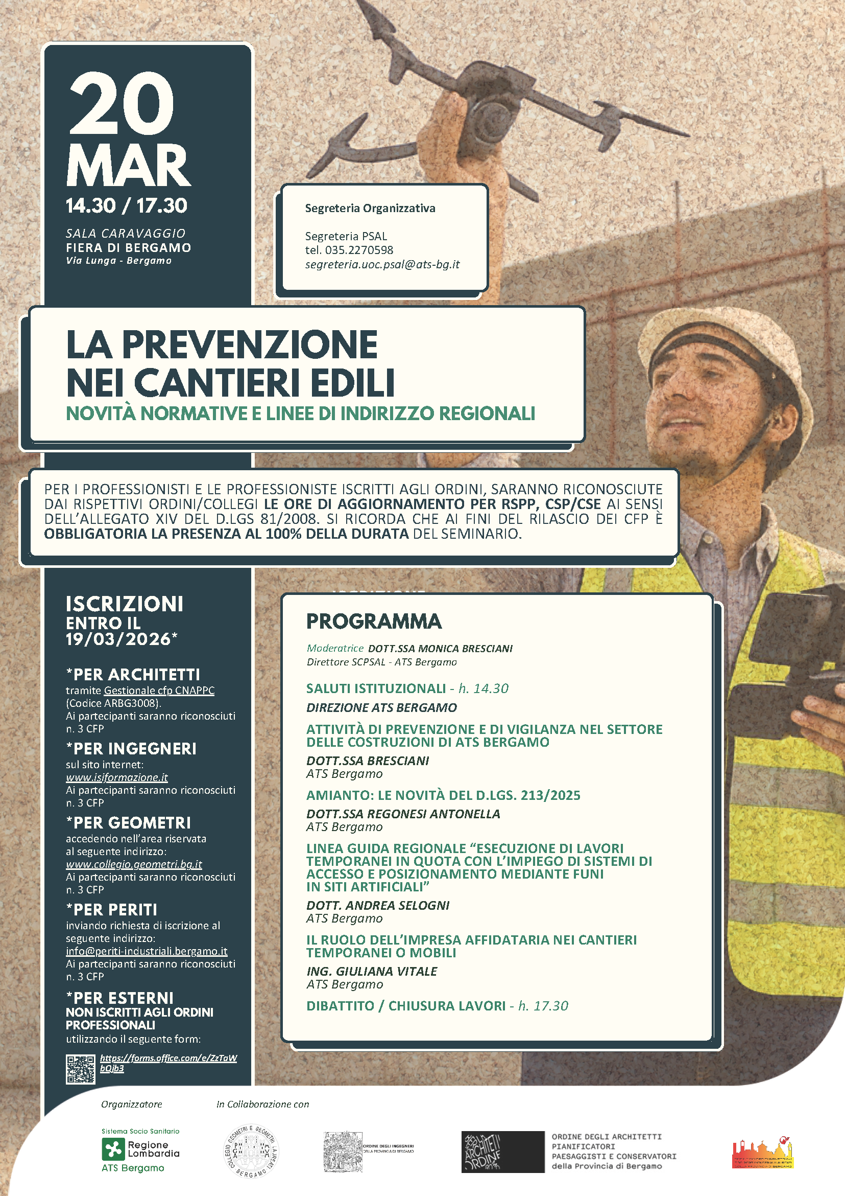 Seminario "La Prevenzione nei cantieri edili" organizzato da ATS in collaborazione con l’Ordine degli Ingegneri, l’Ordine degli Architetti P.P.e C., il Collegio Geometri e Geometri Laureati della Provincia di Bergamo e l’Ordine dei Periti Industriali e dei Periti Industriali Laureati della Provincia di Bergamo che si svolgerà in data 20 marzo 2026 presso la fiera di Bergamo dalle ore 14:30 alle ore 17:30.