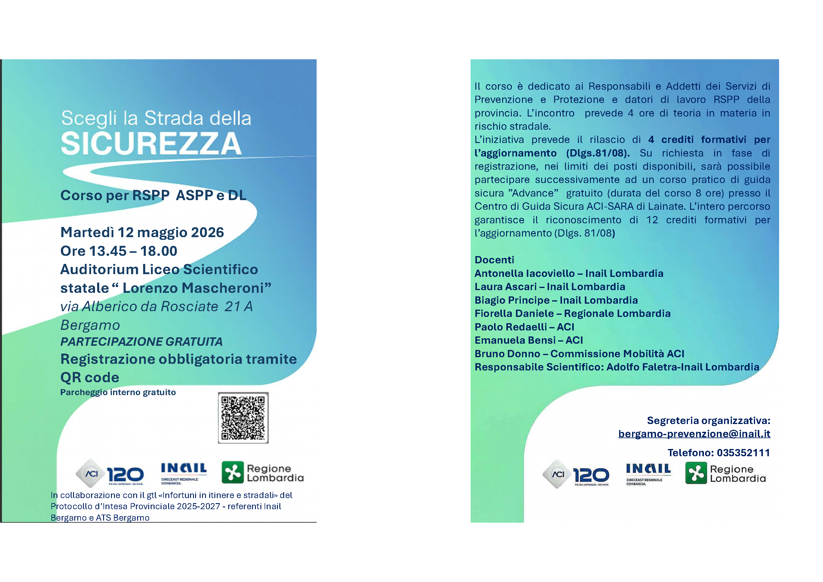 L’iniziativa prevede il rilascio di 4 crediti formativi per l’aggiornamento (Dlgs.81/08). Su richiesta in fase di registrazione, nei limiti dei posti disponibili, sarà possibile partecipare successivamente ad un corso pratico di guida sicura ”Advance” gratuito (durata del corso 8 ore) presso il Centro di Guida Sicura ACI-SARA di Lainate. L’intero percorso garantisce il riconoscimento di 12 crediti formativi per l’aggiornamento (Dlgs. 81/08)