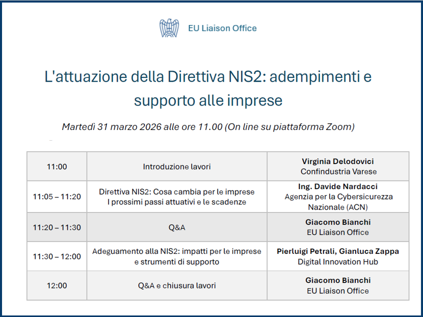L’EU Liaison Office presso la Delegazione di Confindustria a Bruxelles per Confindustria Varese, Confindustria Alto Milanese, Associazione Industriali Cremona, Confindustria Mantova e ANCE Lombardia, ha organizzato per il prossimo martedì 31 marzo, dalle ore 11.00, un webinar di aggiornamento sulla Direttiva NIS2 dal titolo “L'attuazione della Direttiva NIS2: adempimenti e supporto alle imprese”.