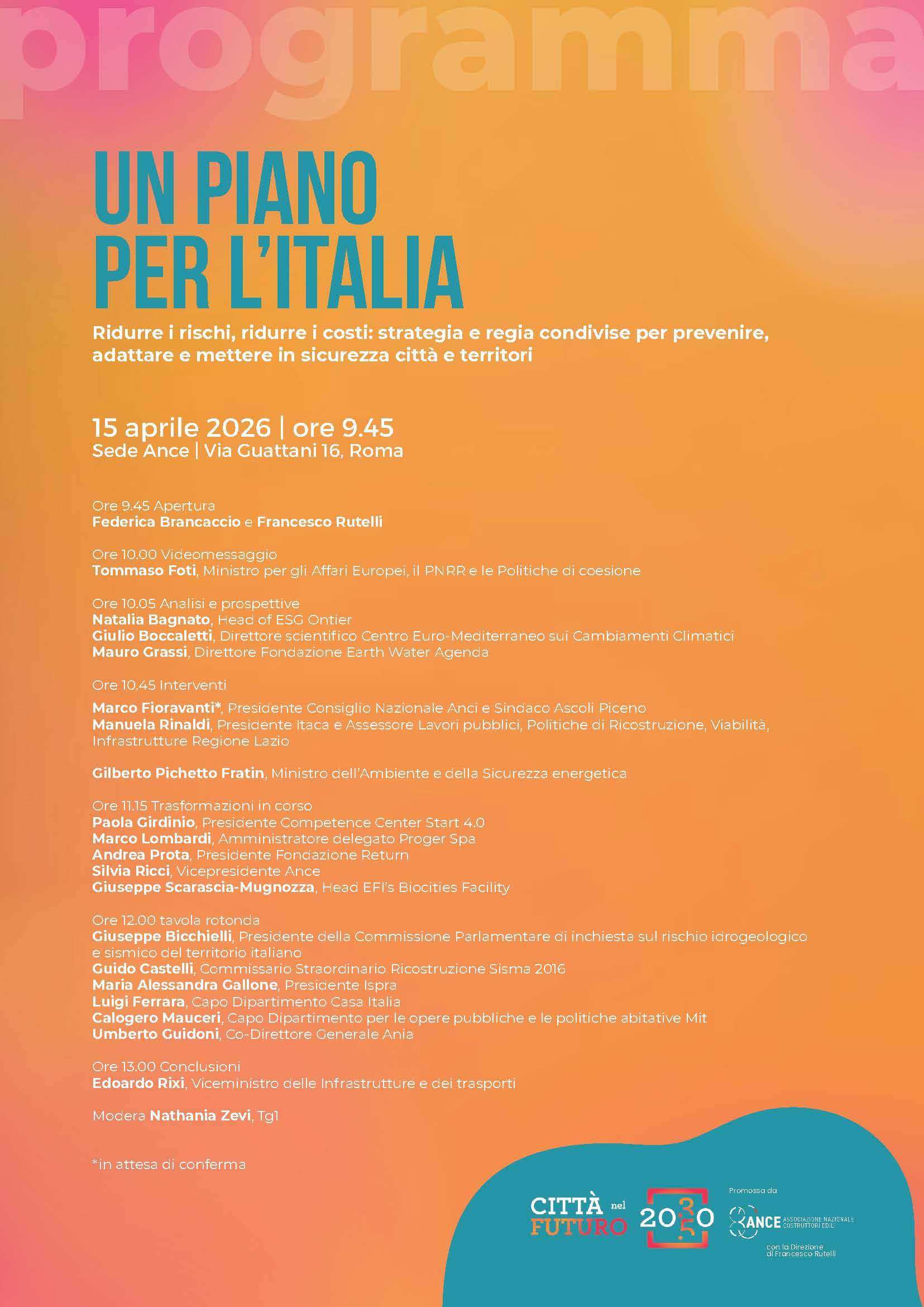 L’evento, organizzato da Ance con la direzione di Francesco Rutelli nell’ambito delle iniziative legate alla “Conferenza Città nel futuro 2030-2050”, sarà occasione per analizzare i rischi e i costi della mancata messa in sicurezza del territorio e presentare una proposta operativa per rilanciare le politiche di adattamento delle città.