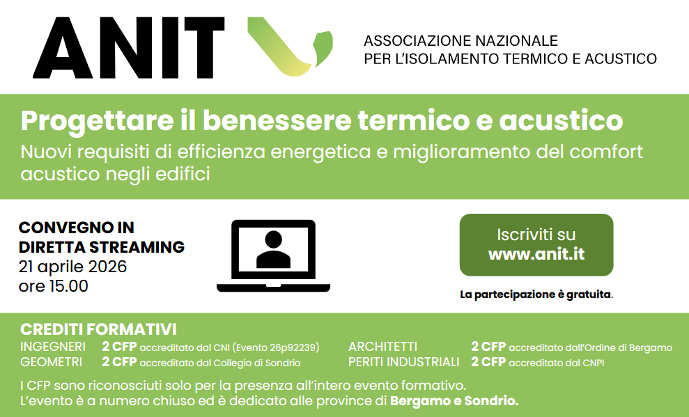 ANIT organizza un convegno, patrocinato tra gli altri da ANCE Bergamo, dal titolo Progettare il benessere termico e acustico per le province di Bergamo e Sondrio in diretta streaming sulla Piattaforma GoToWebinar il 21 aprile 2026 dalle ore 15.00 alle ore 17.00.