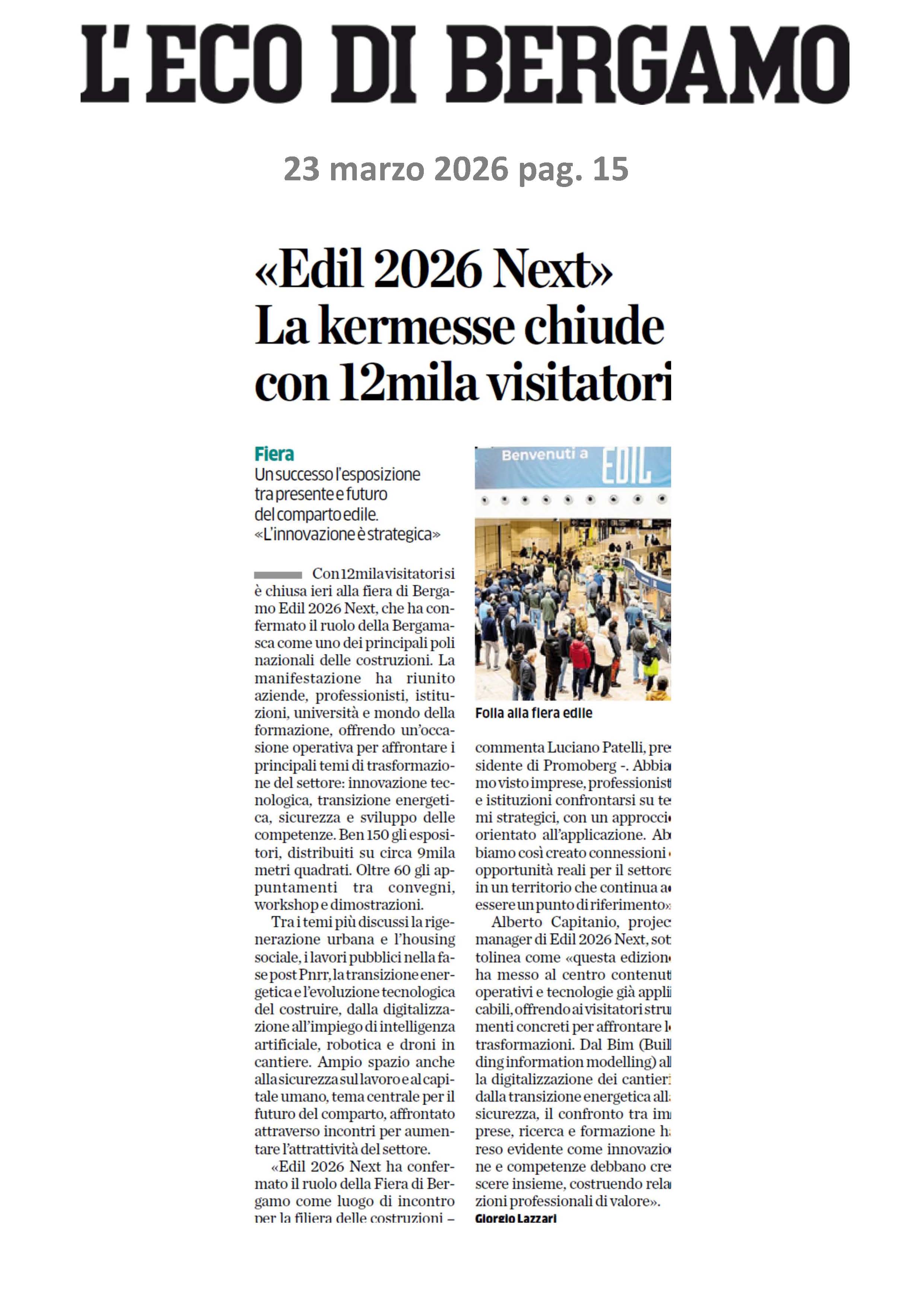 «Edil 2026 Next» La kermesse chiude con 12mila visitatori 23 marzo 2026 L'ECO DI EBRGAMOFiera 2026-03-23-00_pdf
