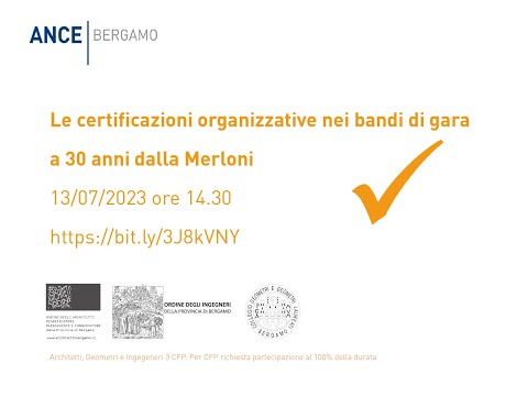 In allegato le presentazioni dei relatori illustrate nel corso del seminario Le certificazioni organizzative nei bandi di gara a 30 anni dalla Merloni tenutosi in data 13.07.2023. Cliccando sull'icona video in basso a sinistra è possibile vedere la registrazione del seminario.