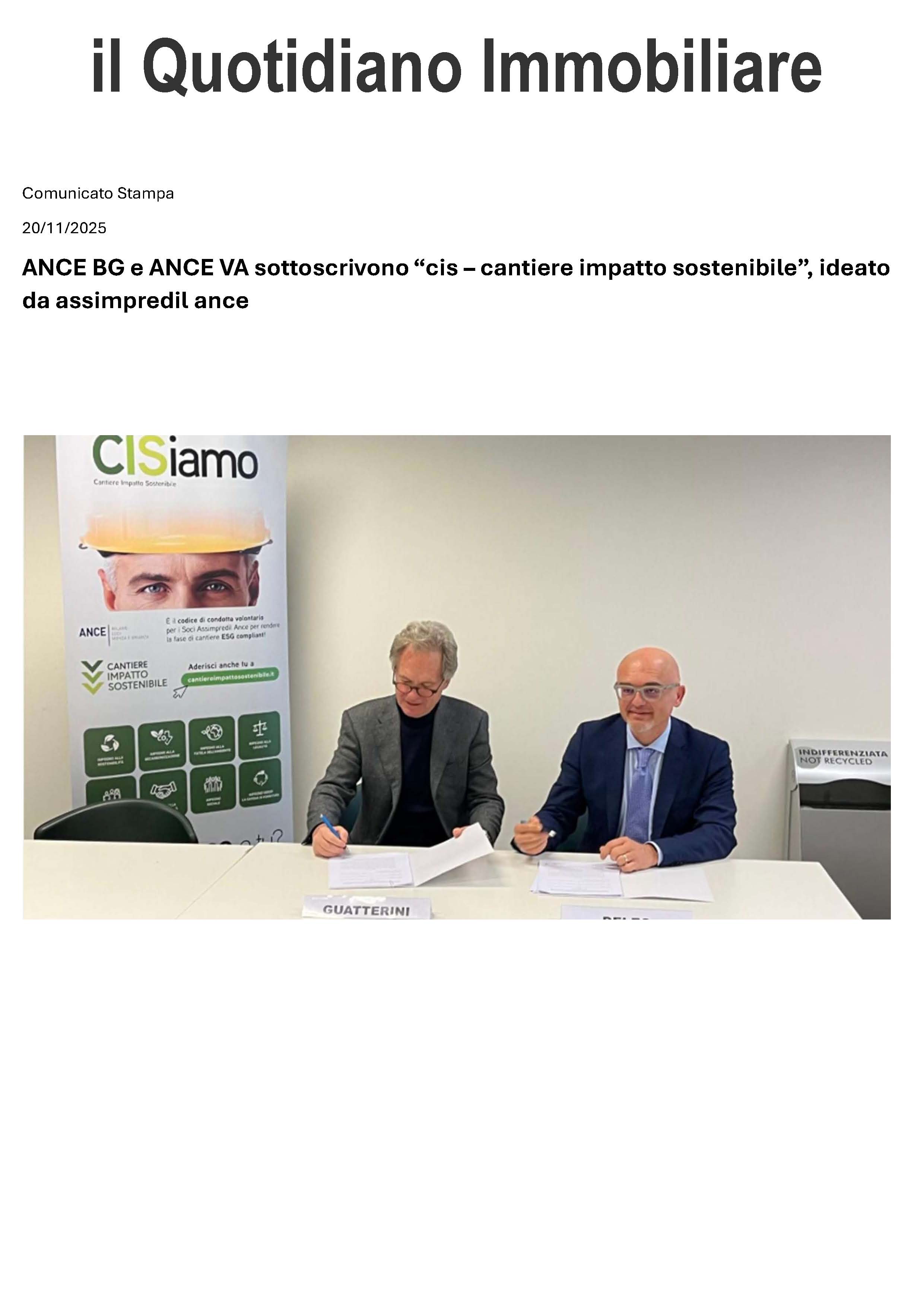 Intervento del presidente di ANCE Bergamo, dott. Renato Guatterini. ANCE BG e ANCE VA sottoscrivono “cis – cantiere impatto sostenibile”, ideato da assimpredil ance 20 novembre 2025 IL QUOTIDIANO IMMOBILIAREComunicato stampa 2025-11-20-K_pdf