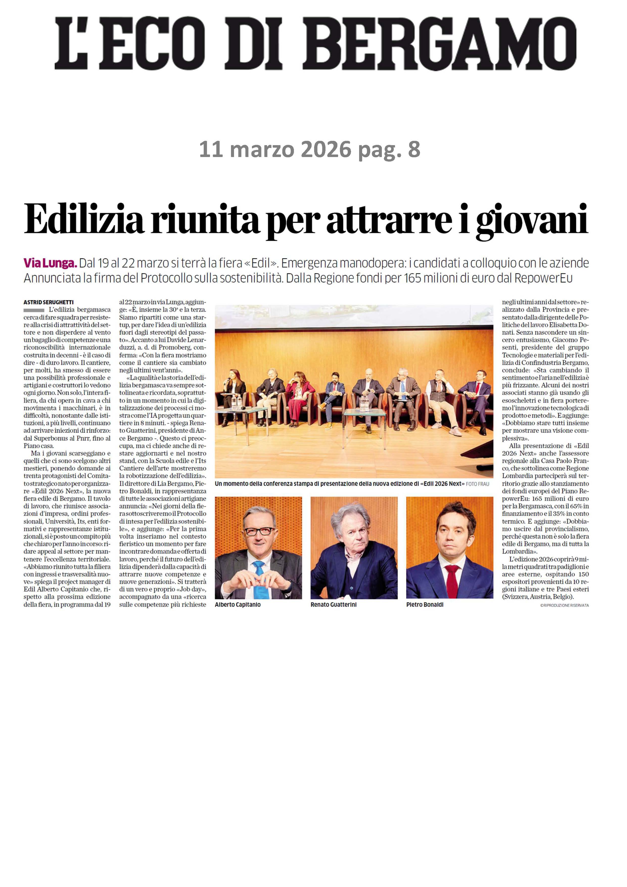 Intervento del presidente di ANCE Bergamo, dott. Renato Guatterini. Edilizia riunita per attrarre i giovani 11 marzo 2026 L'ECO DI BERGAMOVia Lunga 2026-03-11-1_pdf