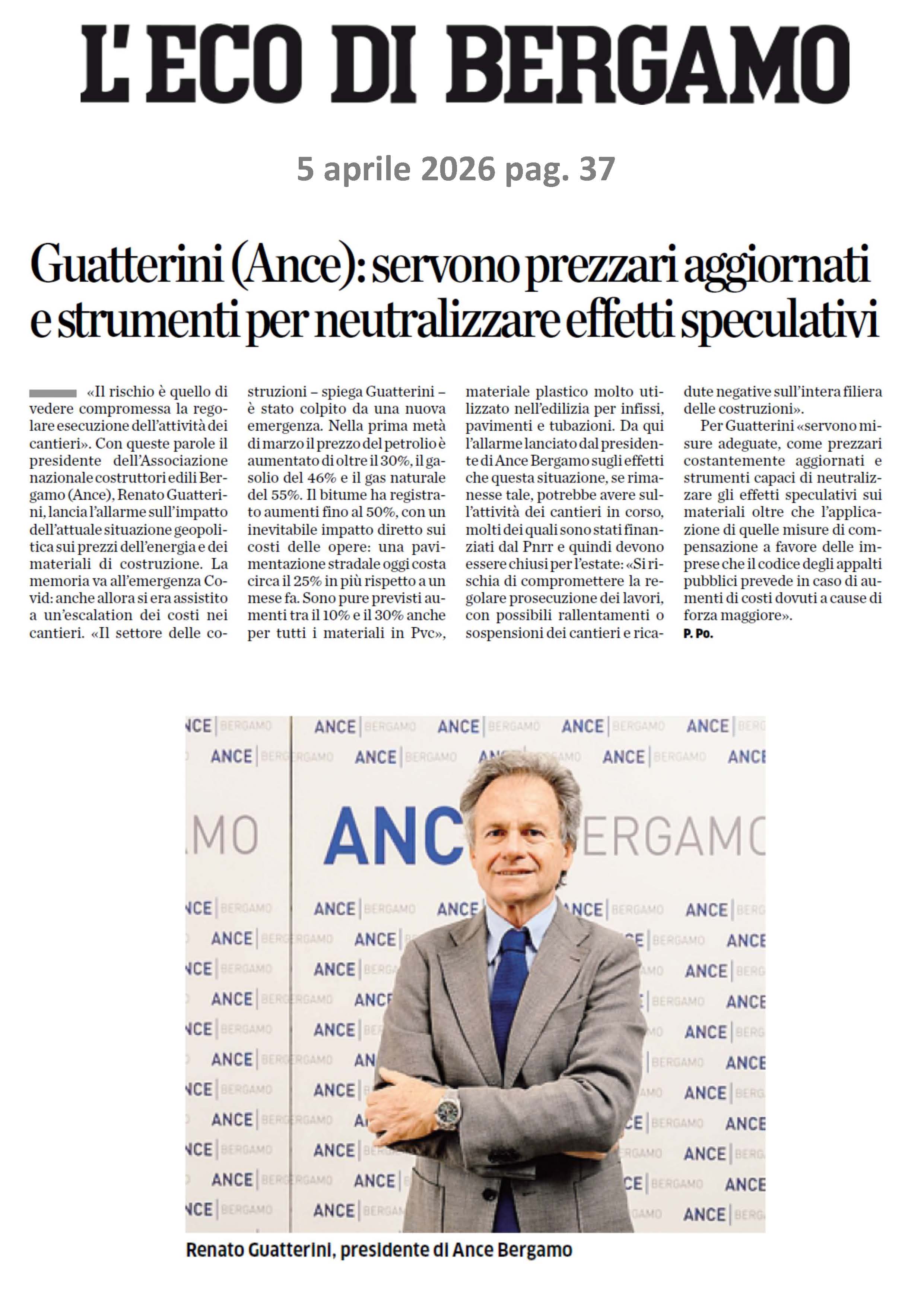 Intervento del presidente di ANCE Bergamo, dott. Renato Guatterini. Servono prezzari aggiornati e strumenti per neutralizzare effetti speculativi 05 aprile 2026 L'ECO DI BERGAMOGuatterini (Ance): servono prezzari aggiornati e strumenti per neutralizzare effetti speculativi 2026-04-05-00_pdf