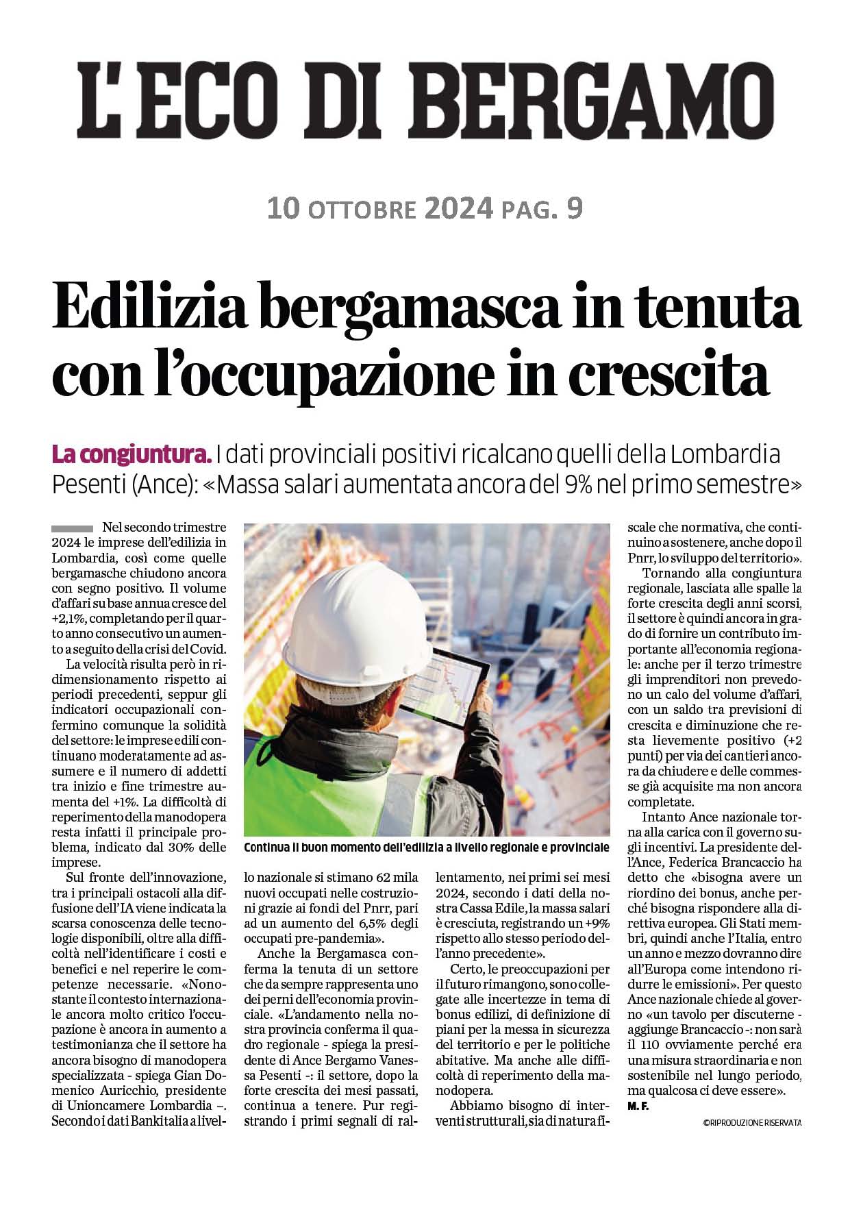 Intervento della presidente di ANCE Bergamo, ing. Vanessa Pesenti. Edilizia bergamasca in tenuta con l'occupazione in crescita. 10 ottobre 2024 L'ECO DI BERGAMOLa congiuntura. 2024-10-10-0_pdf