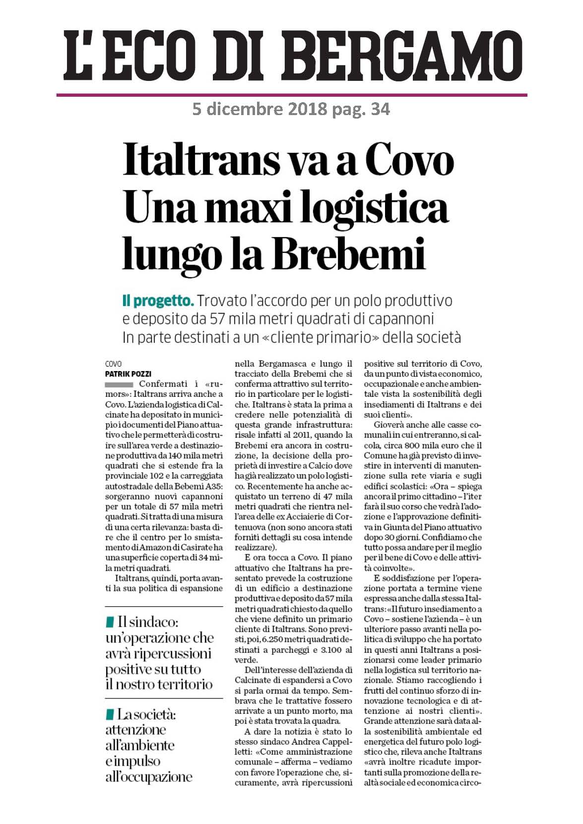 Italtrans va a Covo. Una maxi logistica lungo la Brebemi. 05 dicembre 2018 L'ECO DI BERGAMOTrovato l'accordo per un polo produttivo e deposito da 57 mila metri quadrati di capannoni in parte destinati a "un cliente primario" della società. 2018-12-05-3_pdf