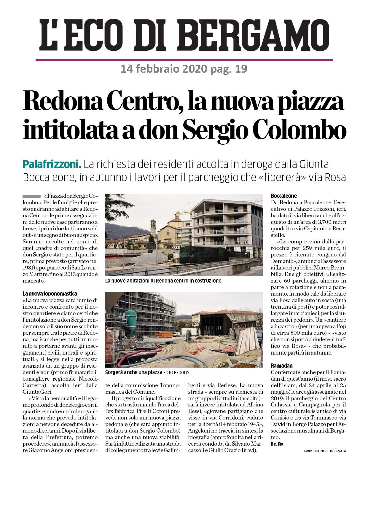 Redona Centro, la nuova piazza intitolata a don Sergio Colombo. 14 febbraio 2020 L'ECO DI BERGAMOPalafrizzoni. La richiesta dei residenti accolta in deroga dalla Giunta. Boccaleone, in autunno i lavori per il parcheggio che "libererà" via Rosa. 2020-02-14-8_pdf